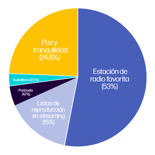 La mayoría (53 %) disfruta escuchando su emisora de radio favorita, mientras que otro 15 % prefiere convertirse en su propio DJ y escuchar listas de reproducción en streaming. Los podcasts (4,7 %) y los audiolibros (2,5 %) constituían las demás opciones de audio.