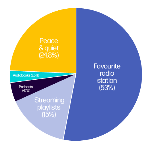 The majority (53%) enjoy listening to their favourite radio station, with another 15% choosing to be their own DJs by streaming playlists. Podcasts (4.7%) and audiobooks (2.5%) made up the other audio options.